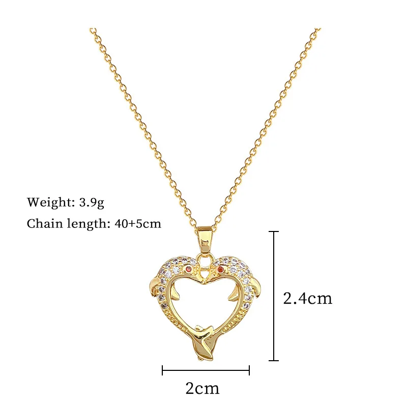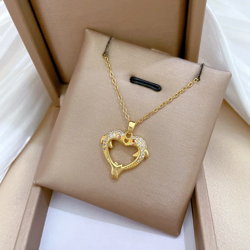 Stainless Steel Chain Necklace Romantic Double Zircon Dolphin Love Heart Pendant Necklaces for Women Jewelry Gifts for Lover