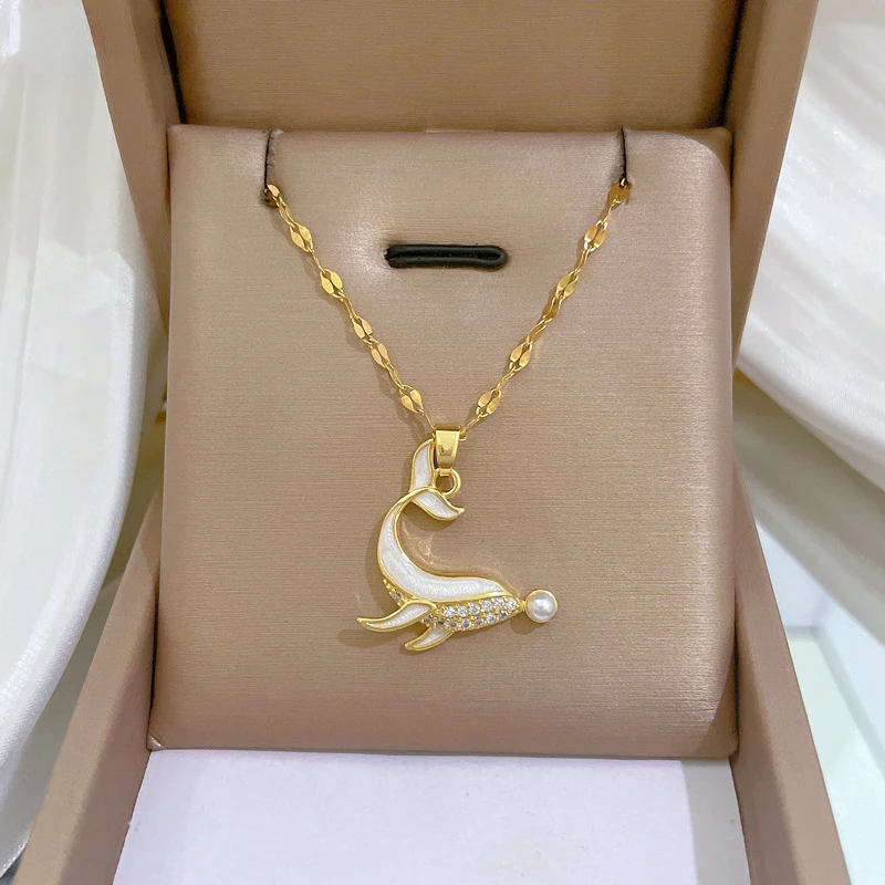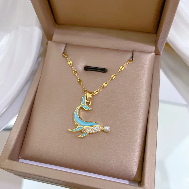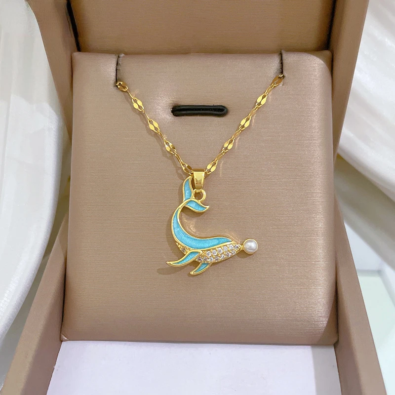 Stainless Steel Dolphin Pearl Necklace for Girls Women Inlaid Enamel Rhinestone Pendant Cute Clavicle Chain Chocker Jewelry Gift