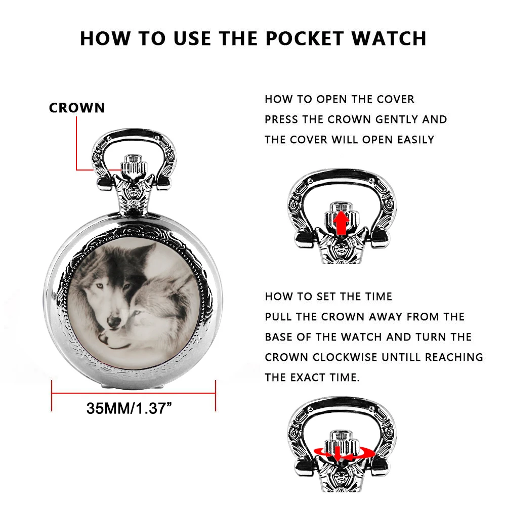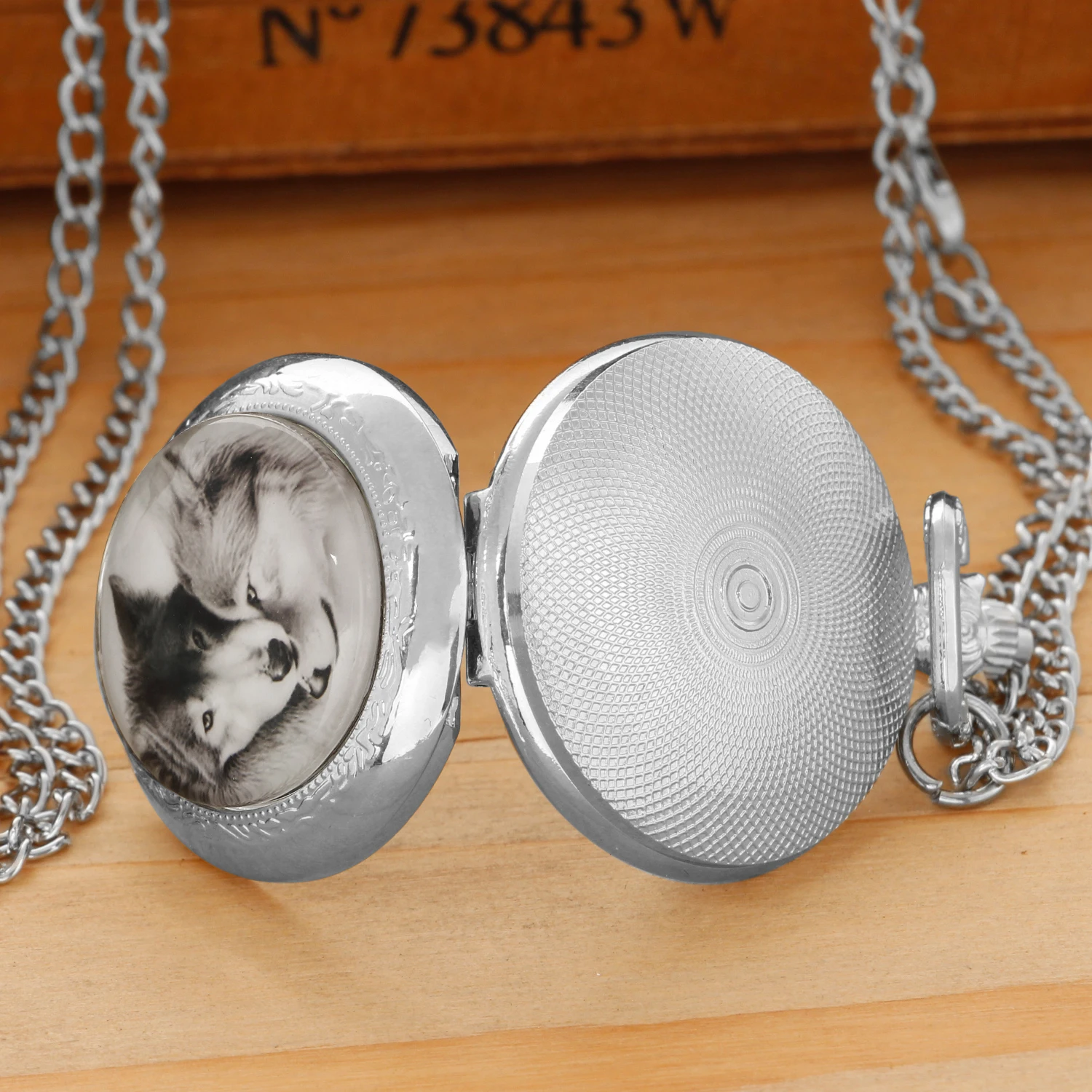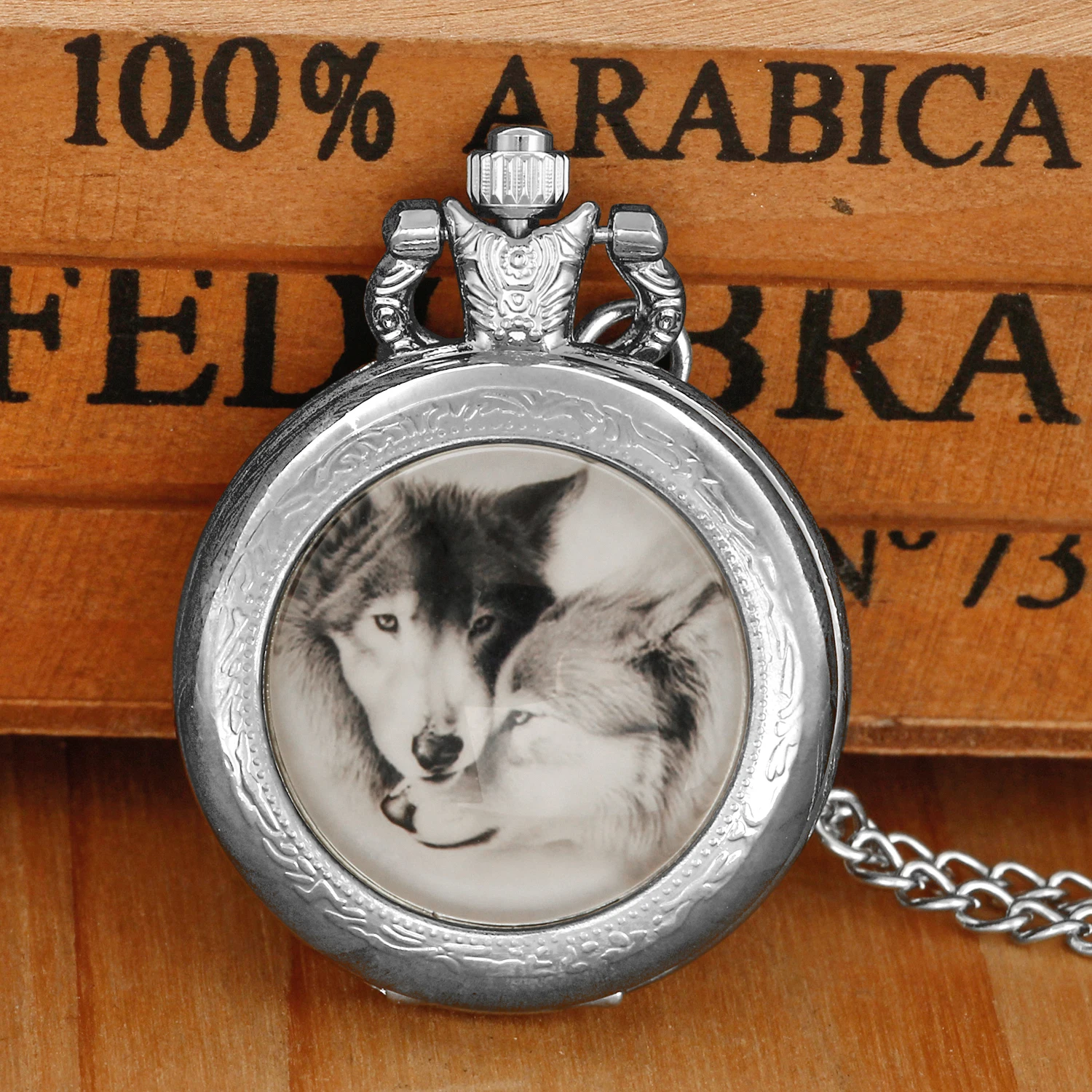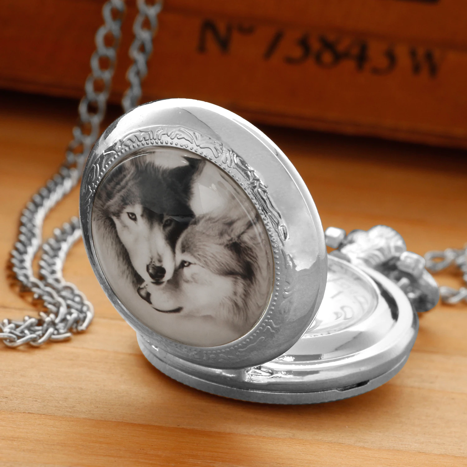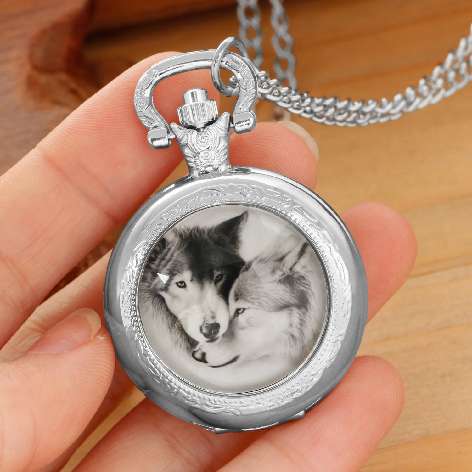 Personalised Fashion Silver Stainless Steel Cool Wolf Glass Dome Quartz Pocket Watch Necklace Women Men Kid Jewelry Pendant Gift